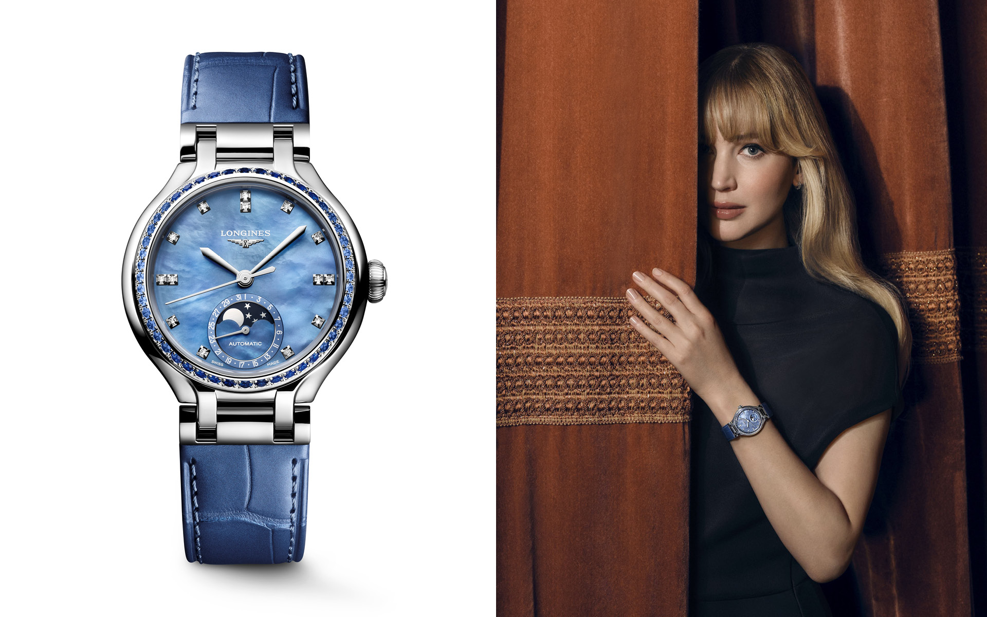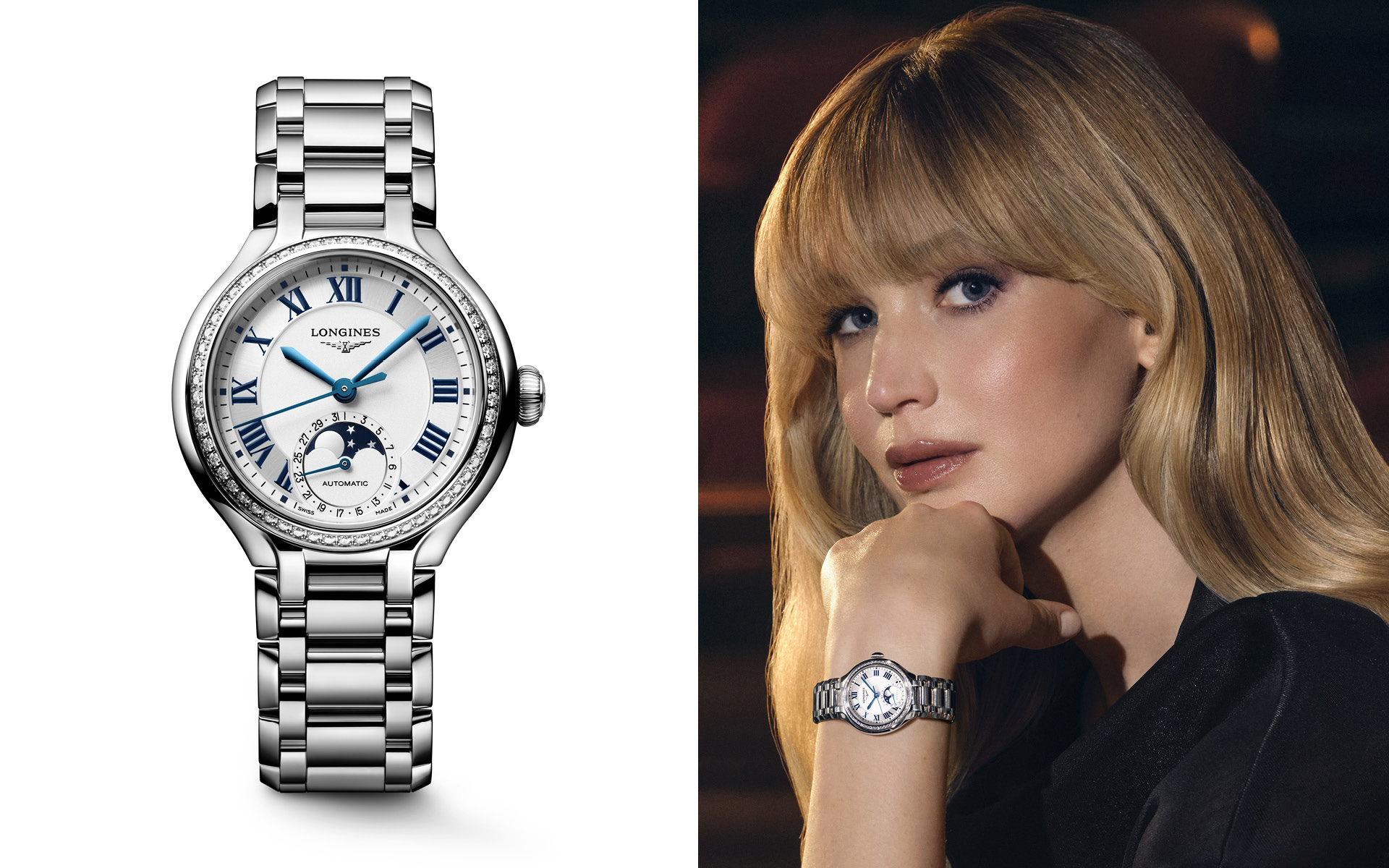 Die Kampagne zur neuen PrimaLuna zeigt die Schauspielerin Jennifer Lawrence in einer leeren Oper – ein Sinnbild für stille Momente, in denen Zeit etwas Persönliches wird. Mit ihrer natürlichen Anmut verkörpert sie die Balance aus klassischer Eleganz und modernem Selbstbewusstsein, die Longines mit dieser Kollektion neu interpretiert.